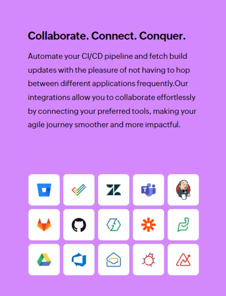 7. Integrations: Zoho Sprints understands the importance of a connected workflow and offers integrations with various tools and platforms. Whether you need to connect with your favorite code repository, CI/CD tools, or other project management software, Zoho Sprints has you covered. These integrations ensure that your team can work with the tools they are familiar with while enjoying the robust features of Zoho Sprints. By integrating with other applications, Zoho Sprints enhances your productivity and ensures a seamless flow of information across different platforms.